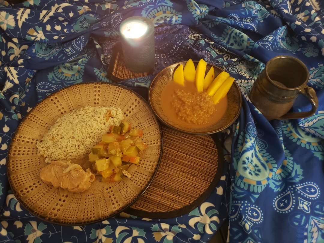 In moments, your plate is heaped with fragrant brown rice, pork so tender it falls apart at a touch, and a mixture of stewed fruits and vegetables. The woman at your left passes you a small bowl already filled with sticky sweet-rice, sliced fruit, and creamy sauce. She winks at you. “Best take a serving early, before my boys eat the pot dry.”