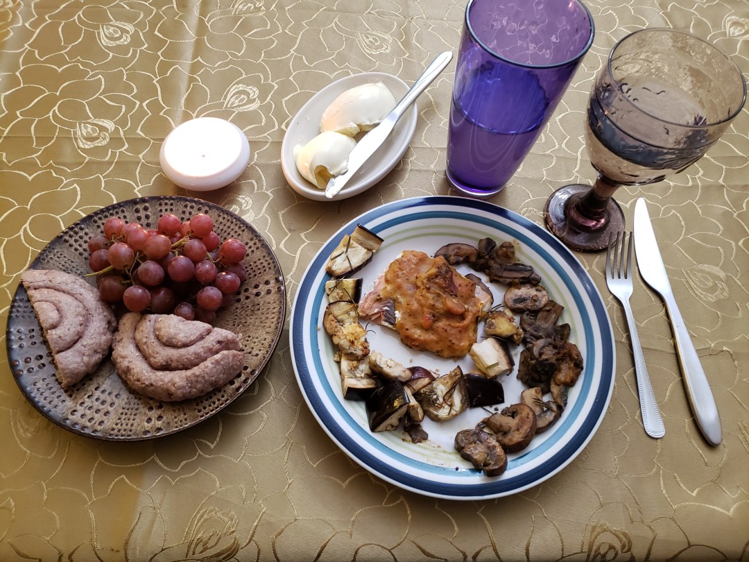 You wait with your hands folded in your lap, watching as the servants dart back and forth. A meal is a presentation, almost a performance, and it’s rude to eat or drink before everything is in its place. The servants finish serving the main plates and return again, this time carrying small side plates heaped with grapes and spirals of warm bread with a faint purplish color. One of the men sets a porcelain butter-dish in the middle of the table with a flourish, and with that the meal is ready to eat.